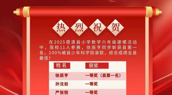 在2025德清县小学数学六年级建模活动中,我校11人参赛,徐辰亨同学斩获县第一名,100%被县少年科学院录取,综合成绩全县最佳!