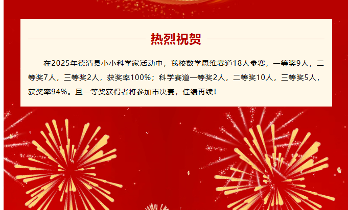 在2025年德清县小小科学家活动中,我校数学思维赛道18人参赛,一等奖9人,二等奖7人,三等奖2人,获奖率100%;科学赛道一等奖2人,二等奖10人,三等奖5人,获奖率94%。且一等奖获得者将参加市决赛,佳绩再续!
